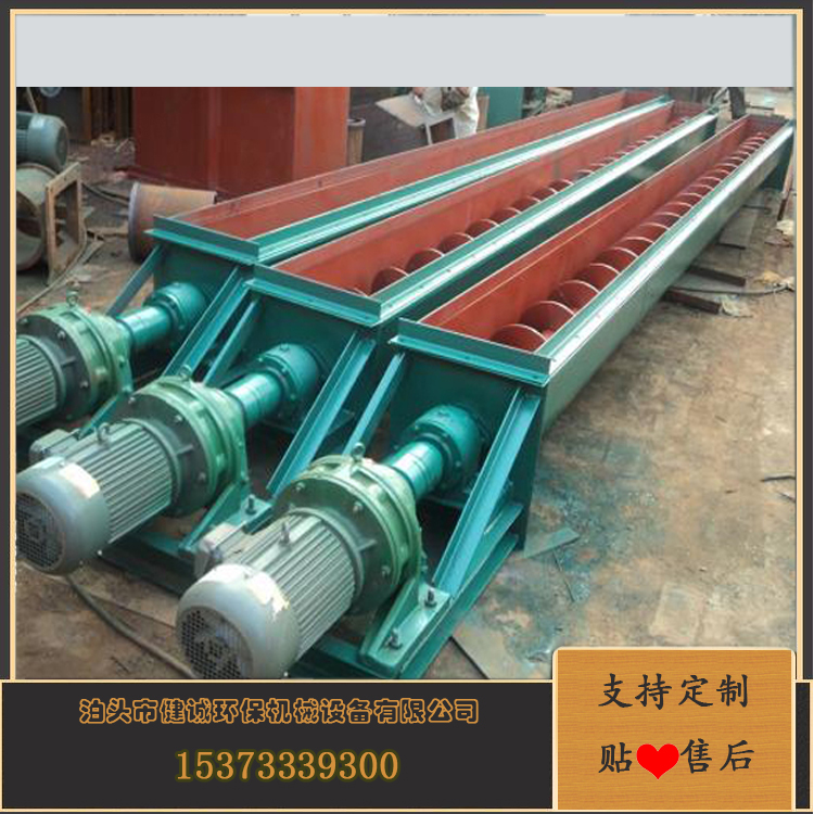 螺旋输送机是一种利用电机带动螺旋回转,推移物料以实现输送目的的机械。它能水平、倾斜或垂直输送,具有结构简单、横截面积小、密封性好、操作方便、维修容易、便于封闭运输等优点。螺旋输送机在输送形式上分为有轴螺旋输送机和无轴螺旋输送机两种,在外型上分为U型螺旋输送机和管式螺旋输送机。有轴螺旋输送机适用于无粘性的干粉物料和小颗粒物料.(例如:水泥、粉煤灰、石灰、粮等)而无轴螺旋输送机适合输送机由粘性的和易缠绕的物料。(例如:污泥、生物质、垃圾等)螺旋输送机的工作原理是旋转的螺旋叶片将物料推移而进行螺旋输送机输送,使物料不与螺旋输送机叶片一起旋转的力是物料自身重量和螺旋输送机机壳对物料的摩擦阻力。螺旋输送机旋转轴上焊的螺旋叶片,叶片的面型根据输送物料的不同有实体面型、带式面型、叶片面型等型式。螺旋输送机的螺旋轴在物料运动方向的终端有止推轴承以随物料给螺旋的轴向反力,在机长较长时,应加中间吊挂轴承。