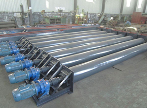 水泥等粉料的输送必须在完全密封的腔体内运行,以免污染环境和输送物料受潮.O型截面的螺旋输送机是应用最广泛的粉料供料输送装置.其机壳采用无缝钢管,常见规格有,直径219,直径273,直径325.机壳尾部进口通过球形铰链与筒仓翻板门连接,头部出口通过帆布袋柔软连接通向主体上的粉料称斗.安装倾角一般在30度-45度之间,必要时可达60度.螺旋的长度不应超过14米,可通过更换中间节段得到不同的螺旋总长度.更长的输送距离可通过螺旋接力的方式实现,接续螺旋设置两个进料口.机壳中的旋转体由心管与连续式的螺旋叶片组焊而成,中间节段的螺旋体采用中间支承和无油润滑的联轴节.